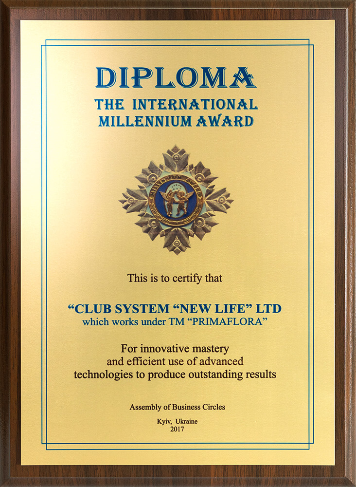 А засновник та технолог ТМ «ПРИМАФЛОРА» НЕЛЮБОВА ЛЮБОВ ВІКТОРІВНА нагороджена ОРДЕНОМ «НАГОРОДА ТИСЯЧОЛІТТЯ» і підтверджуючим сертифікатом під № 219, про входження до АССАМБЛЕЮ БІЗНЕС КОРОЛЕЙ.